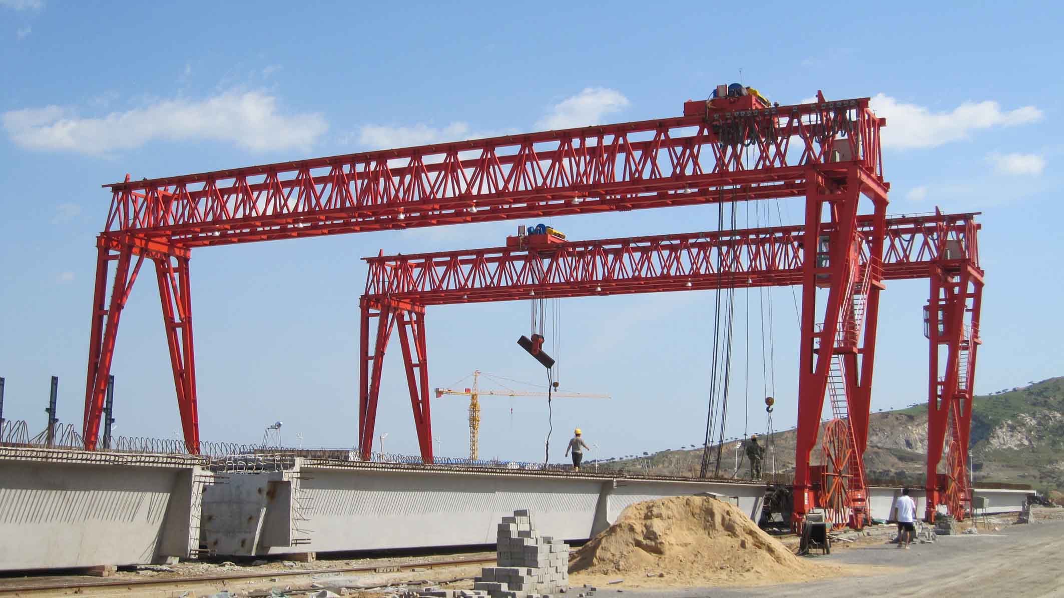工程用門(mén)式起重機(jī)主要適用于公路、橋梁、電廠等建設(shè)工場(chǎng),進(jìn)行一般的裝卸及起重搬運(yùn)作業(yè)。整機(jī)采用桁架結(jié)構(gòu),自重輕,輪壓小,性能可靠。主要采用型鋼和鋼管拼接而成,主梁可以分段組裝在一起。從其結(jié)構(gòu)上一般分為單主梁和雙主梁形式,起升機(jī)構(gòu)一般為卷?yè)P(yáng)機(jī),根據(jù)其工作特性,起升度和運(yùn)行速度較慢,造價(jià)較低,適合工地使用。
