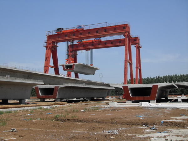 該設(shè)備既可兩臺(tái)配合抬吊預(yù)制梁,也可以單臺(tái)起重機(jī)配雙吊具起吊預(yù)制梁,兩臺(tái)同時(shí)起重的提梁機(jī)各自的起重量一般為450噸,單臺(tái)起重的提梁機(jī)起重量通??蛇_(dá)900噸。它配置支腿行走、天車行走及天車起吊設(shè)備,可以實(shí)現(xiàn)全方位機(jī)械化動(dòng)作。主要用于將預(yù)制梁從制梁臺(tái)提吊至存梁臺(tái)位,預(yù)制梁養(yǎng)護(hù)完成后將其從存梁臺(tái)位吊運(yùn)到運(yùn)梁車上。作為起重設(shè)備完成架橋機(jī)的組裝和拆卸。還用于架設(shè)墩身不高的旱橋。