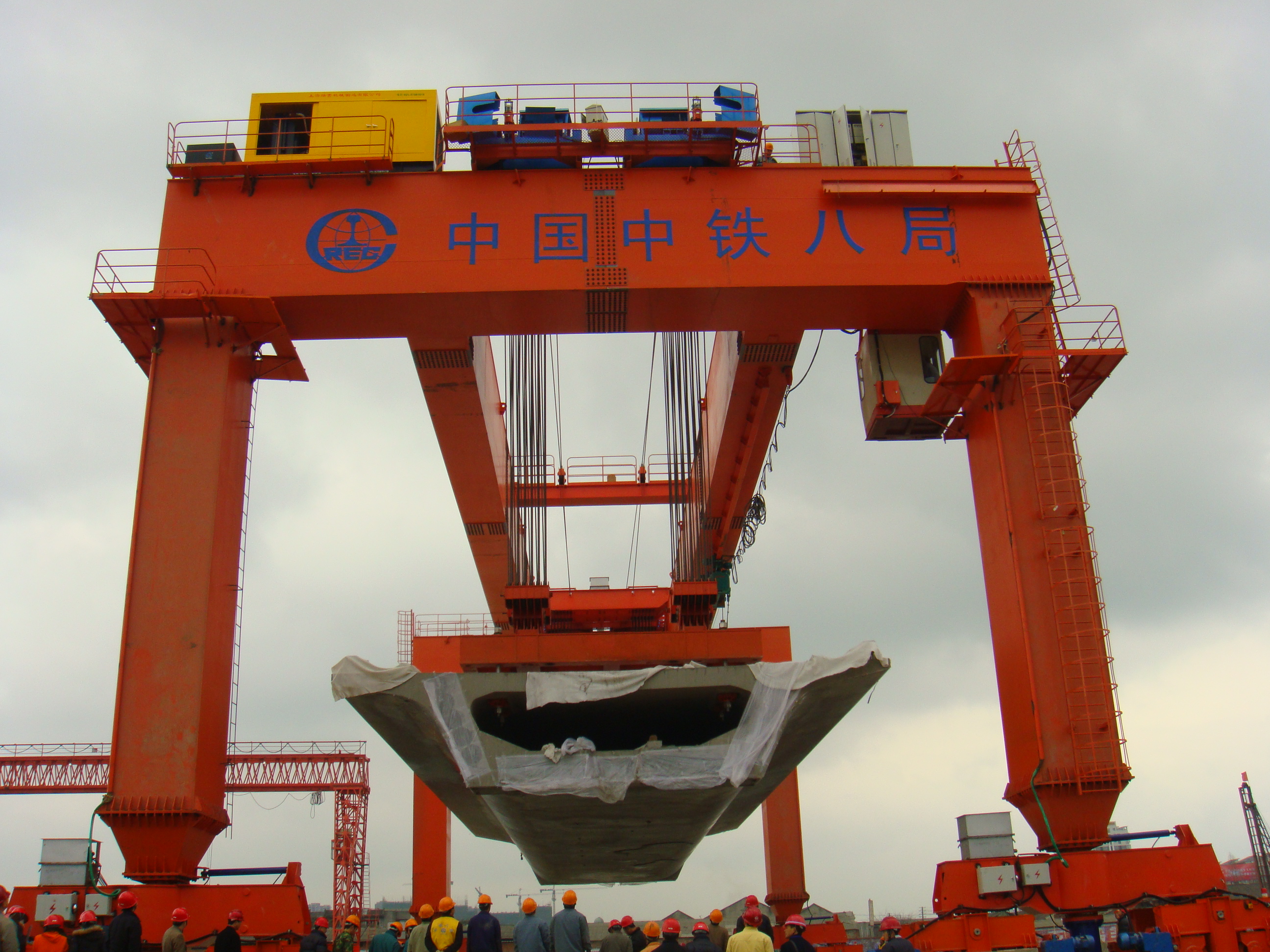 該設(shè)備既可兩臺(tái)配合抬吊預(yù)制梁,也可以單臺(tái)起重機(jī)配雙吊具起吊預(yù)制梁,兩臺(tái)同時(shí)起重的提梁機(jī)各自的起重量一般為450噸,單臺(tái)起重的提梁機(jī)起重量通常可達(dá)900噸。它配置支腿行走、天車(chē)行走及天車(chē)起吊設(shè)備,可以實(shí)現(xiàn)全方位機(jī)械化動(dòng)作。主要用于將預(yù)制梁從制梁臺(tái)提吊至存梁臺(tái)位,預(yù)制梁養(yǎng)護(hù)完成后將其從存梁臺(tái)位吊運(yùn)到運(yùn)梁車(chē)上。作為起重設(shè)備完成架橋機(jī)的組裝和拆卸。還用于架設(shè)墩身不高的旱橋。