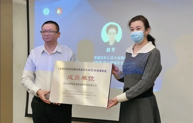 中國(guó)健康促進(jìn)基金會(huì)超重與肥胖病防控專(zhuān)項(xiàng)基金管理委員會(huì)副主任兼秘書(shū)長(zhǎng)、全國(guó)衛(wèi)生產(chǎn)業(yè)企業(yè)管理協(xié)會(huì)美容產(chǎn)業(yè)分會(huì)會(huì)長(zhǎng)、中國(guó)國(guó)際減肥大會(huì)執(zhí)行主席盛杰主席為《體重管理誠(chéng)信服務(wù)評(píng)價(jià)規(guī)范》團(tuán)體標(biāo)準(zhǔn)課題組成員單位——四川纖養(yǎng)管家健康管理服務(wù)有限公司頒發(fā)榮譽(yù)銅牌。